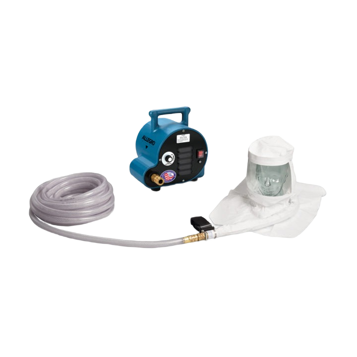 Our Single Bib Tyvek Hood Breathing Air Blower Respirator Systems provide a portable air source for one or two workers. They include one or two NIOSH approved disposable, lightweight Tyvek hood(s), a breathing air blower, flow meter, and one or two 50 foot breathing air hose(s). Includes NIOSH approved respirator(s).